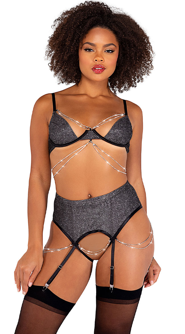 Treat your sweeties to a sexy surprise in this provocative bra set featuring metallic underwire cups with draping rhinestone accents, adjustable spaghetti straps, a hook and eye back closure, a matching garter belt with adjustable garter straps, and a matching panty with an open crotch and booty framing straps. (Stockings not included.)