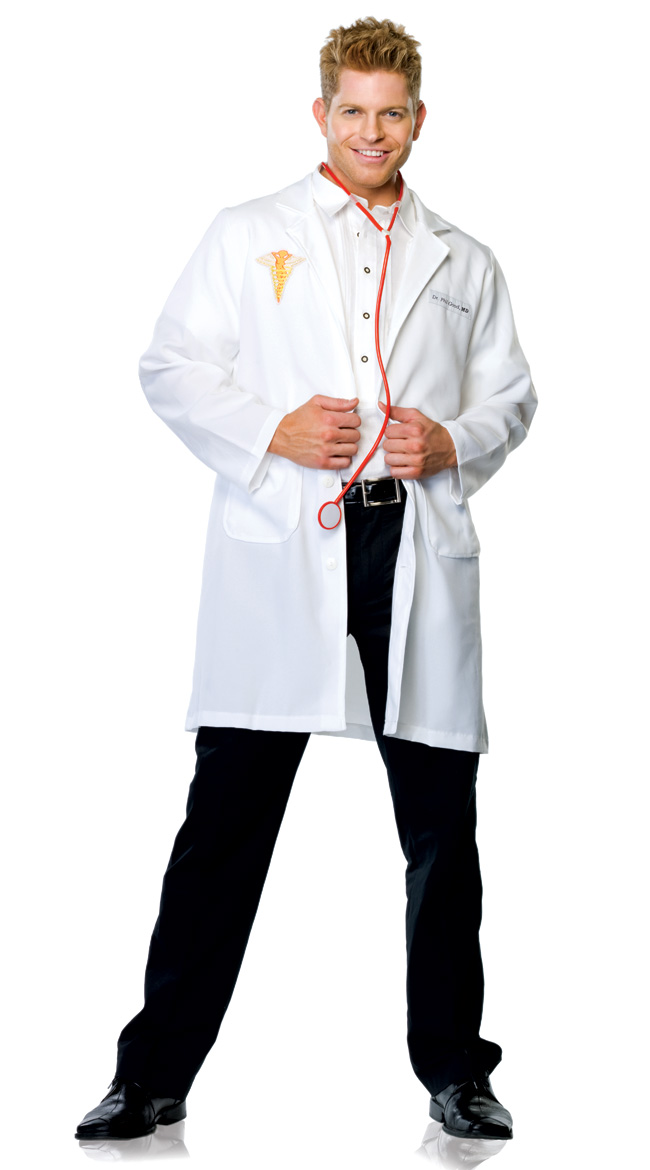 Get hearts pounding in this men's Dr. Phil Good Doctor costume featuring a white lab coat with long sleeves, front pocket accents, button closures, a "Dr. Phil Good MD" patch, gold hospital logo embroidery, and a toy red stethoscope. (Shirt and pants not included.)