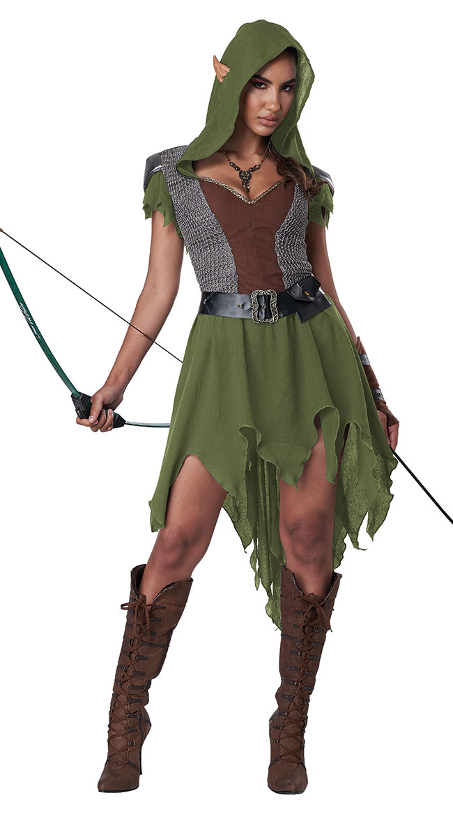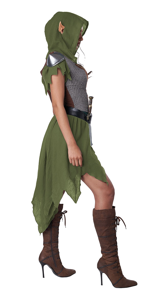 It's time to live out your fantasy. Set out on a quest to find the ring in this Elven Archer costume featuring a green metallic knit dress with padded short sleeves, a high low skirt with a jagged hem, a black adjustable waist belt with decorative buckle and attached coin purse, a loose hood, and one single fingerless glove. (Necklace, ears, boots, and bow and arrow not included.)