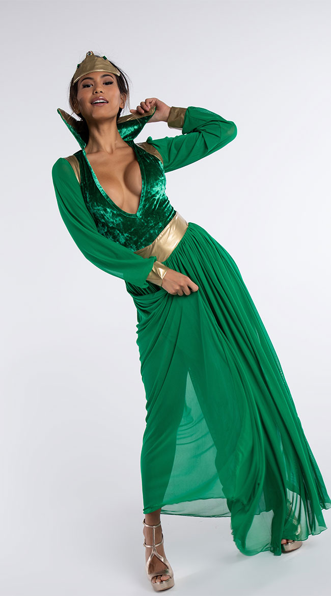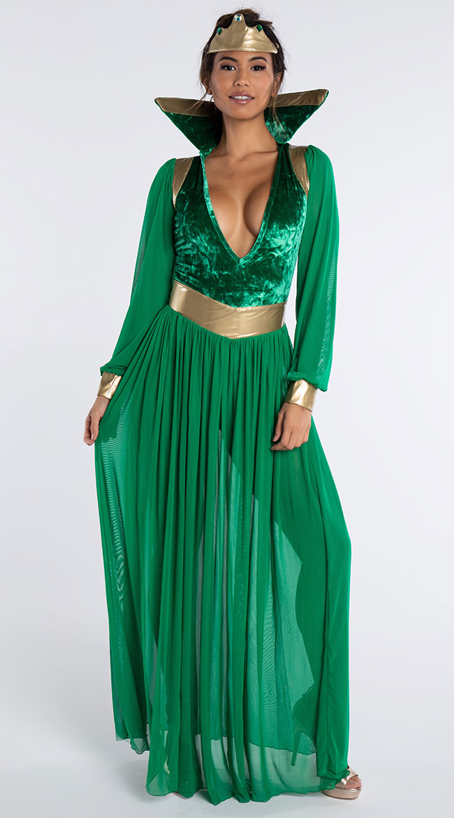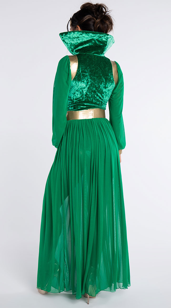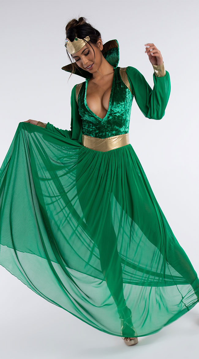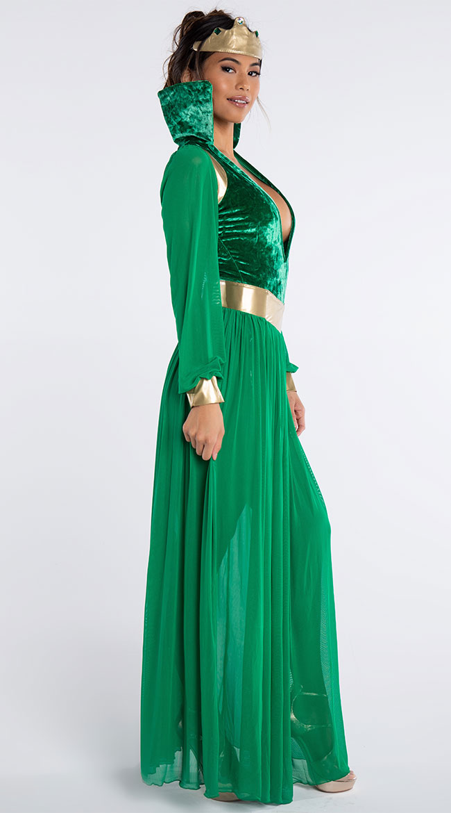 They'll turn green with envy when they find out you're immortal. Long live your youth in this Eternal Queen costume featuring a green velvet romper dress with plunging neckline, prominent stand up collar with gold trim, long mesh sleeves with gold cuffs, a striking gold belt, a flowy mesh skirt with a draping hem, and a matching gold crown headpiece. (Shoes not included.)