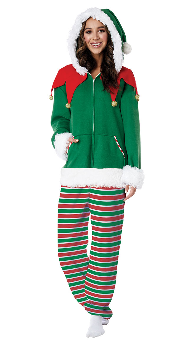 No one puts this elf on a shelf! You'll be the cutest little helper in this unisex Extraordinary Elf Onesie costume featuring a green fleece onesie with a zip up closure and front pockets, a red collar with gold ball details, an attached hood with a white pompom, and striped pants (Gift and socks not included.)