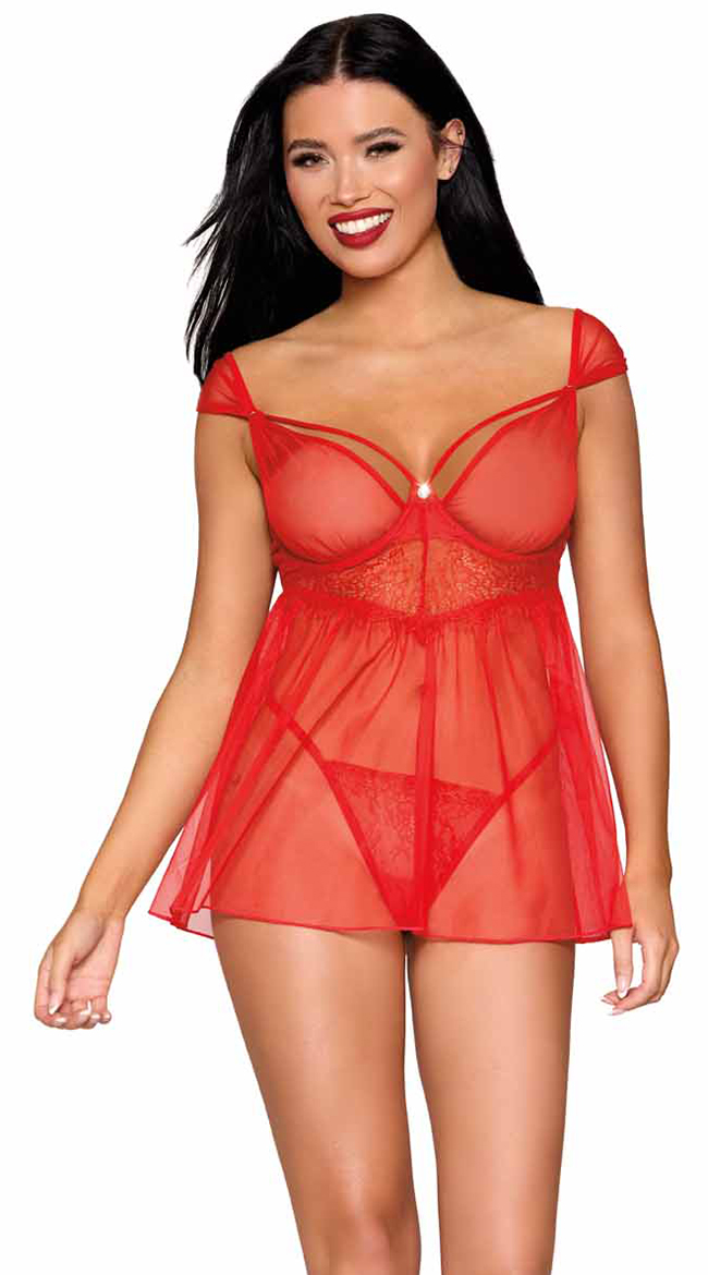• Eyelash lace with stretch mesh babydoll and G-string set