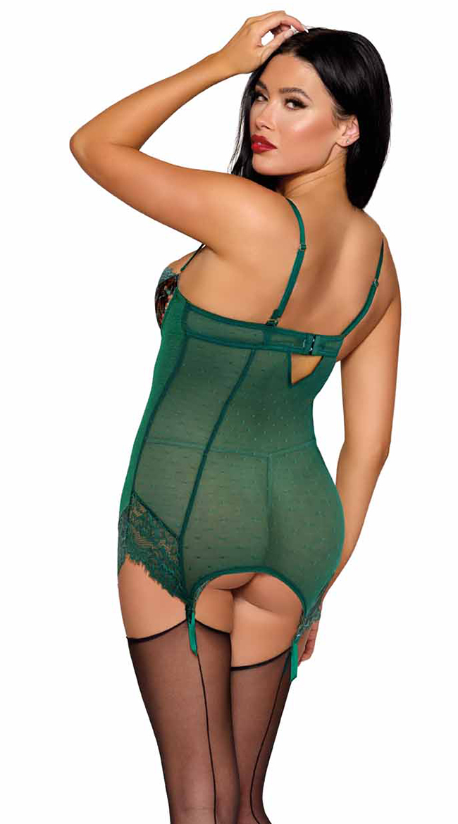 • Printed stretch velvet garter slip with dot mesh and lace trim