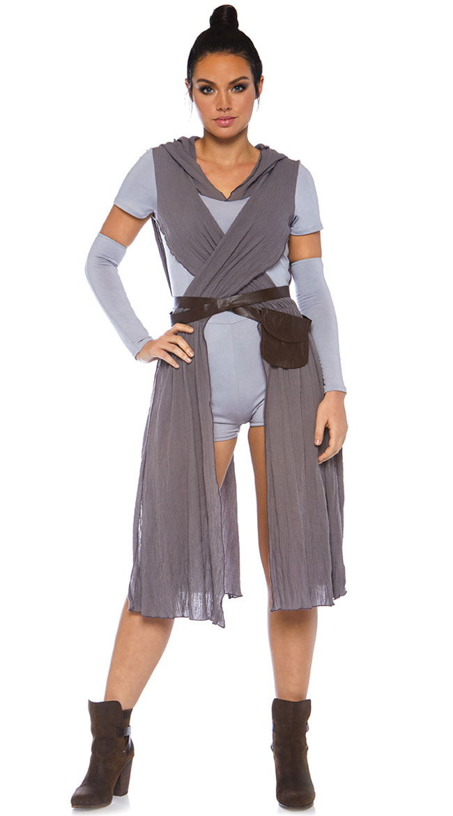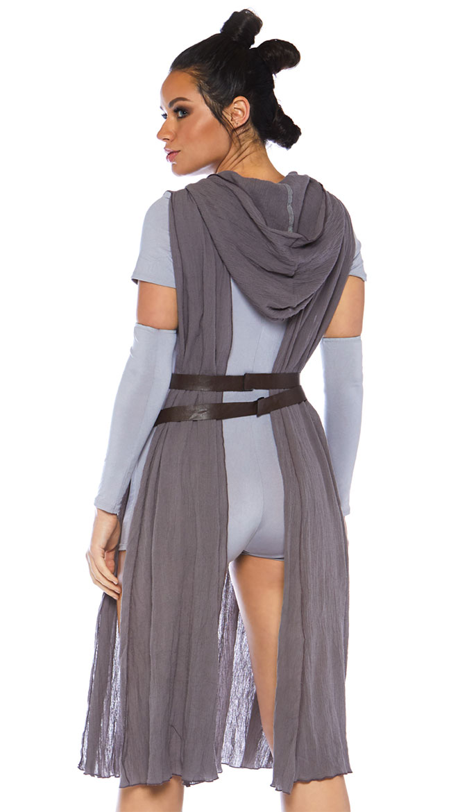 Fight off the dark side in this Galaxy Rebel costume featuring a grey romper with short sleeves, a criss-cross gauze sash, an attached hood, a full back, a double strapped belt with pouch detail, and matching arm pieces. (Staff not included.)