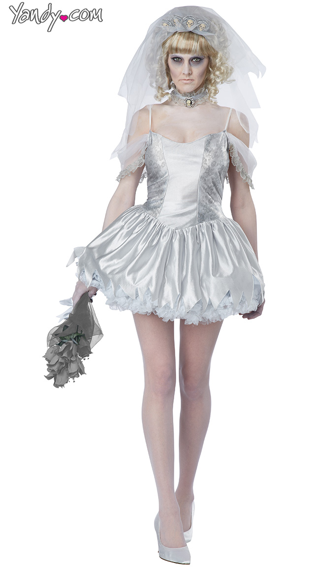 Stay loyal till death do you part in this Ghost Bride costume featuring a grey and white mini dress with spaghetti straps, draping off-the-shoulder sleeves with lace detailing, a ruffled skirt, a tattered mesh overskirt, a ruffled choker with a charm embellishment, and a matching veil with skull headpiece. (Flowers and pantyhose not included.)