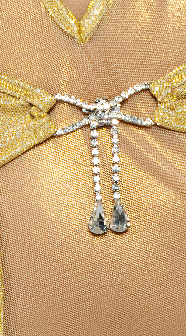 • Rhinestone bow hardware and trim, steel boning, hook & eye closure