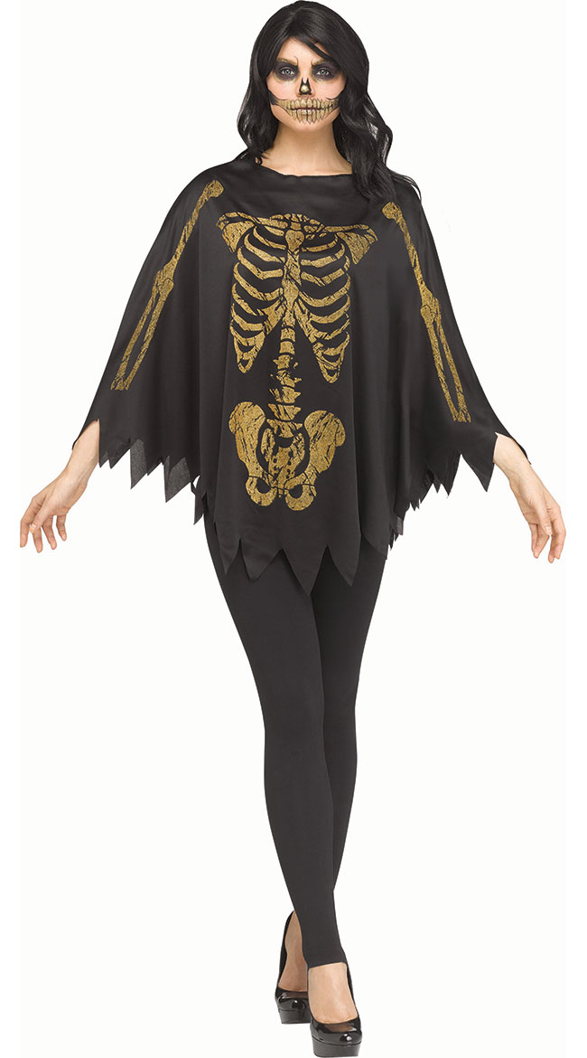 Bare your bones in this fun Glitter Skeleton Poncho costume featuring a gold skeleton rib cage print, and a jagged hem. (Face paint, wig, pants, and shoes not included.)
