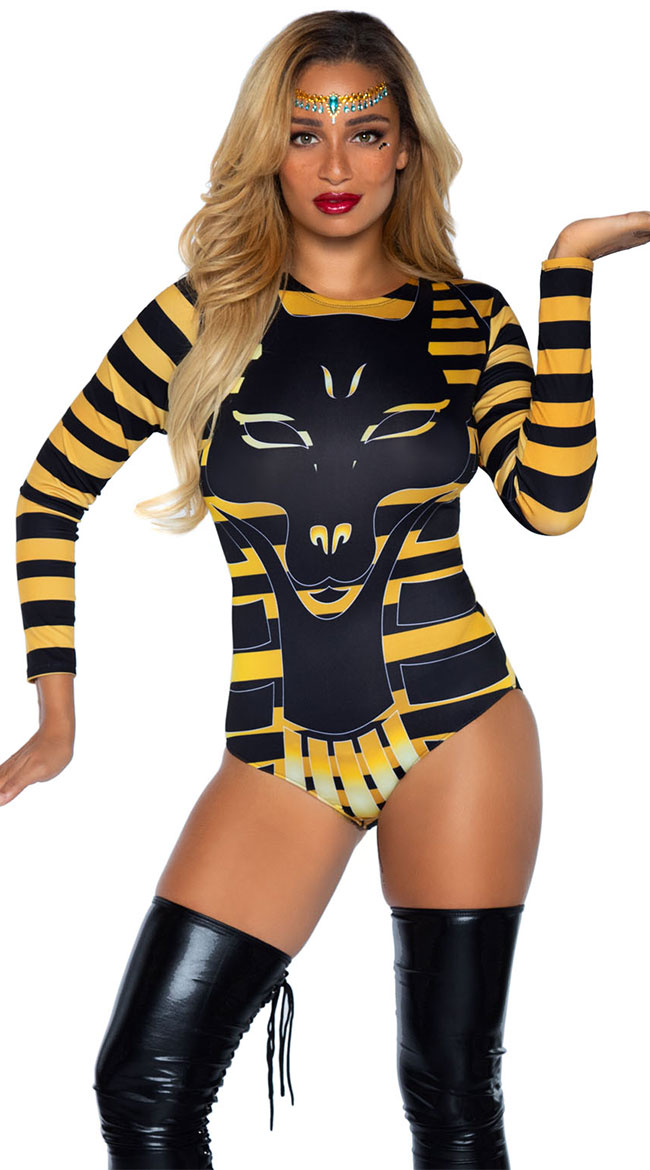 Mummify your Mr. in this Goddess Anubis costume featuring a black and yellow striped bodysuit with an Egyptian god face print, long sleeves, a snap crotch, and a cheeky cut back. (Face jewels and boots not included.)