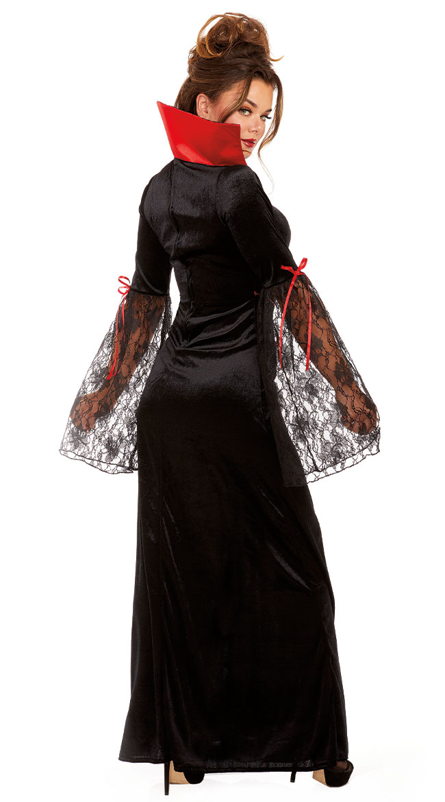 Scream away! Hypnotize the victim of your choice in this Gorgeous Ghoul costume featuring a velvet collared gown with a flared skirt with lace insets, a center front applique with sequin accents and lace trim, delicate lace sleeves, red sequin piping, and a gothic cross necklace.