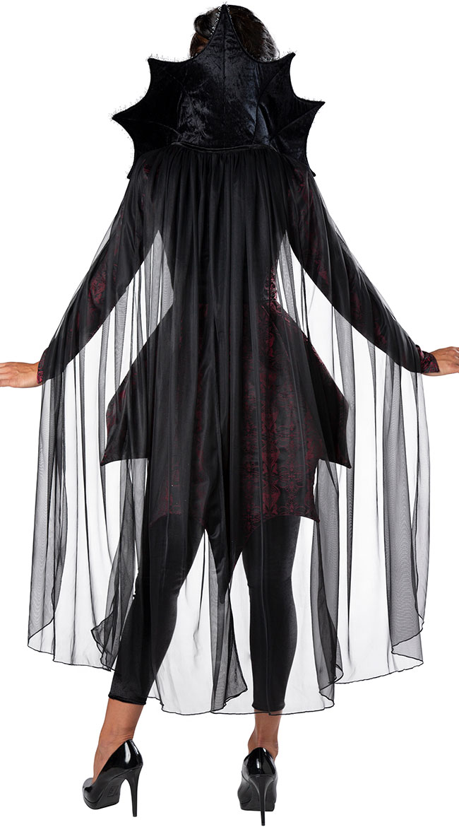 Everything about you will draw people in. Your gorgeous looks, your scent, and of course your sexy Halloween costume. Let your prey come to you in this Gothic Romance Vampire costume featuring a red embroidered jacket with long sleeves, a sweetheart neckline, silver button closures, a tall jagged collar, black leggings, a sheer tulle cape, and an intricate choker with red gem embellishments.