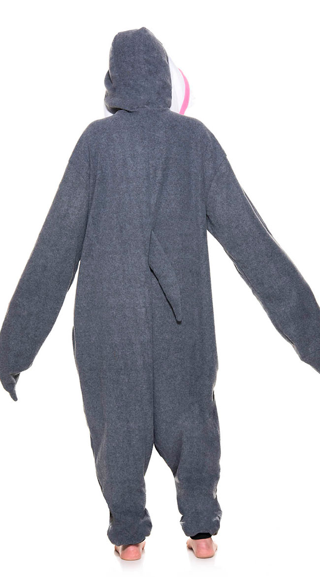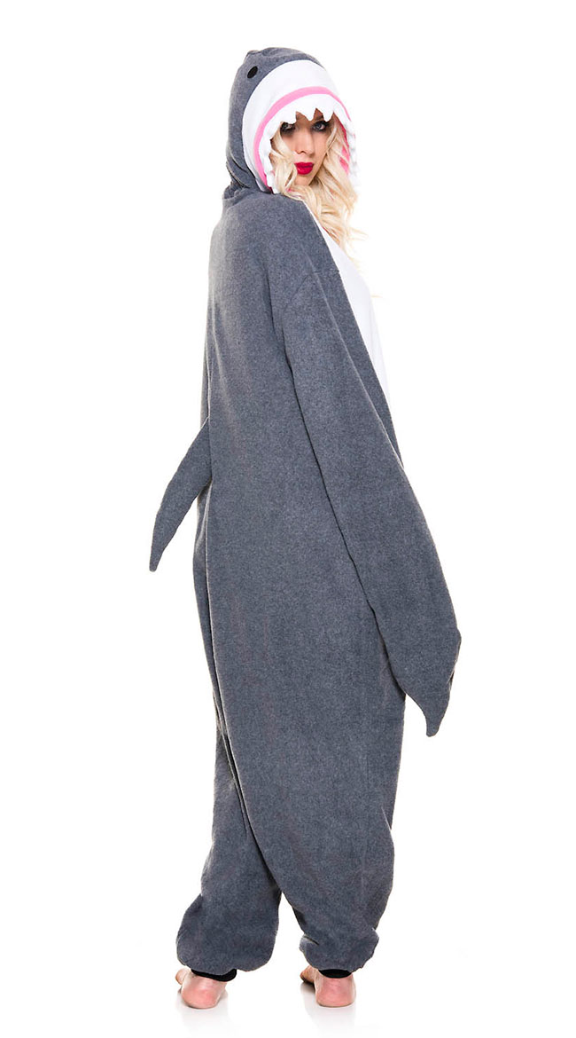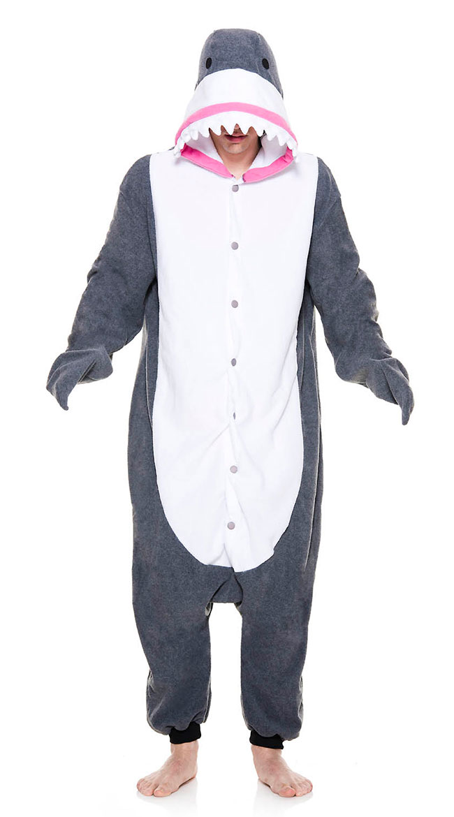 Take a dive into the deep blue! Get chummy with the ocean's scariest predator in this unisex Kigurumi Great White Shark Onesie costume featuring a button front closure, over-the-hand fin long sleeves, elastic ankle cuffs, a roomy body style, an oversized shark face hood with jagged teeth, and an attached tail fin.