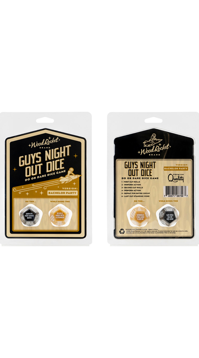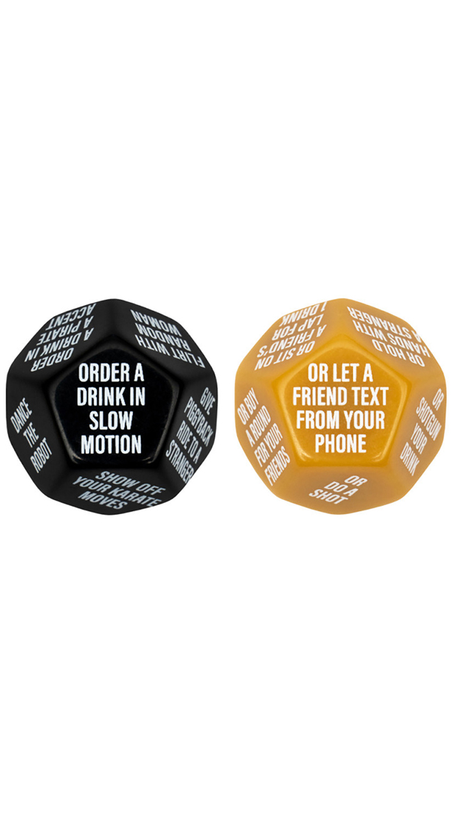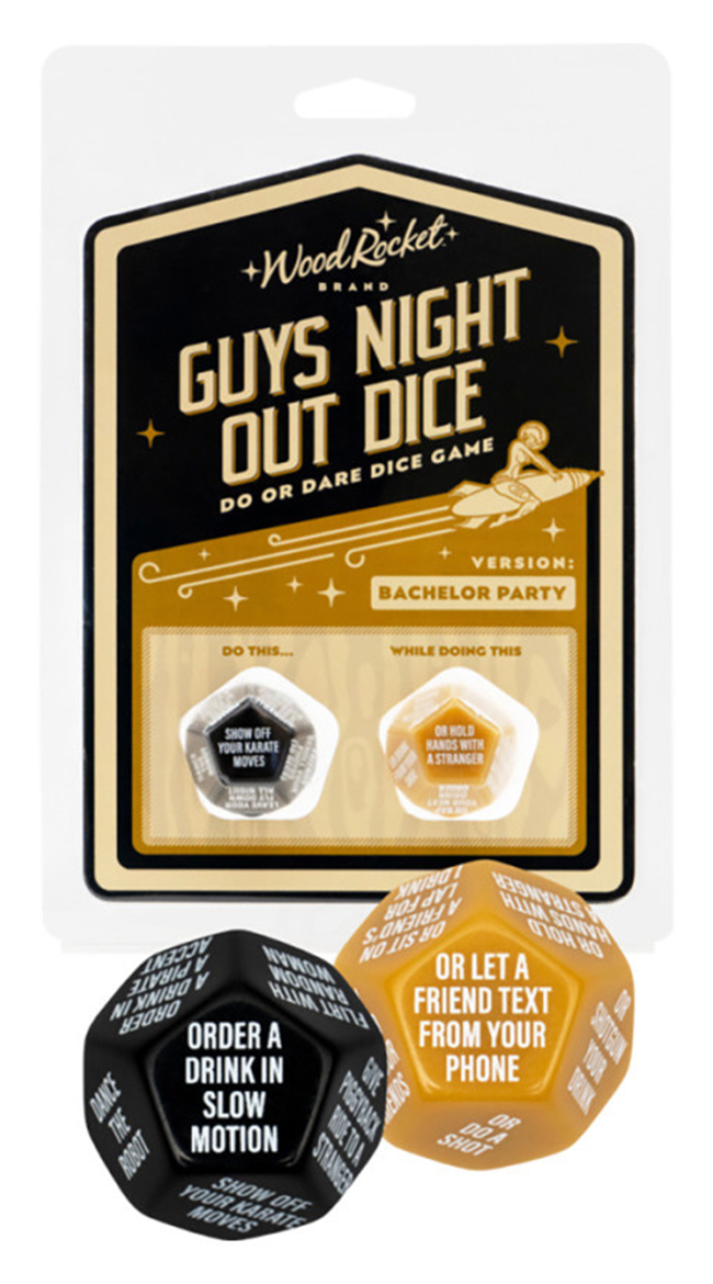 Roll play with this Guys Night Out Do Or Dare game. Dice bachelor party game! Features two large 28mm 12-sided dice that tell you and your crew what to do, if you dare. Last guy standing wins!