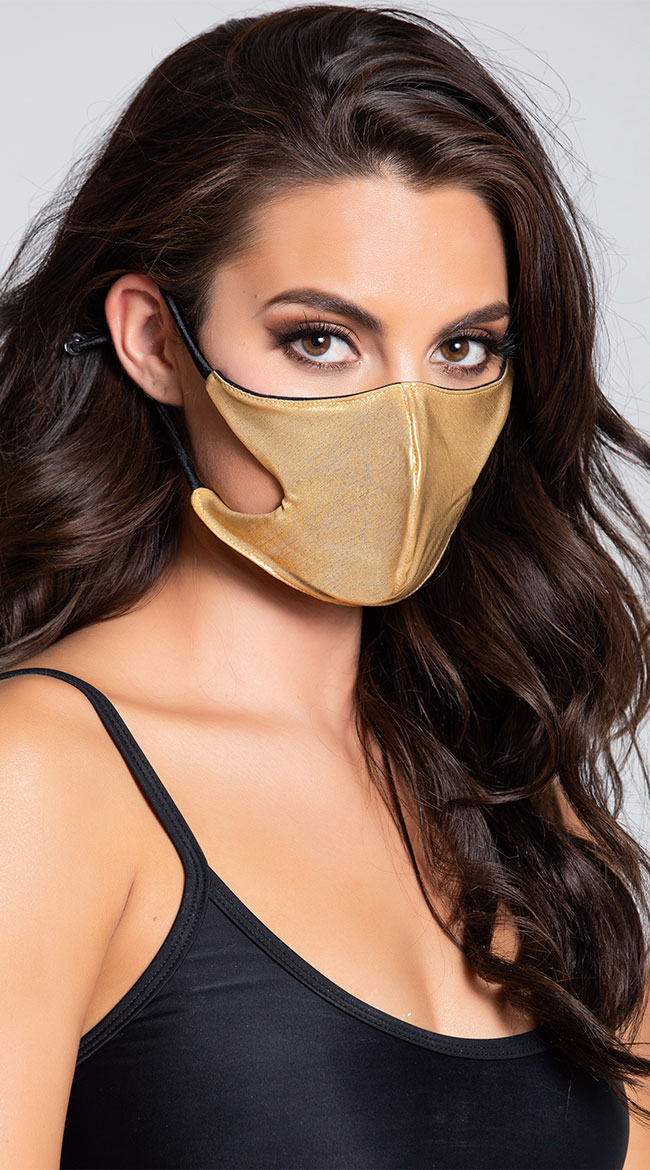 Go bold (for gold) and beautiful in this sexy face mask featuring a metallic foil look, a front seam for easier breathing, adjustable elastic ear loops for a tight fit, and sexy side cut-outs. Fully lined. (Top not included.)