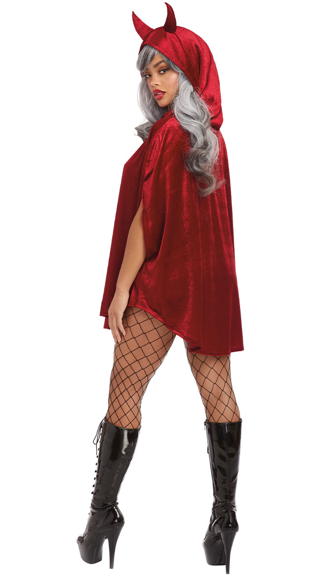 Get ready to raise hell! You'll be a hot little demon in this Hell Yeah costume featuring a short red velvet poncho, arm slits, and a hood with horns. (Stockings, wig, and shoes not included.)