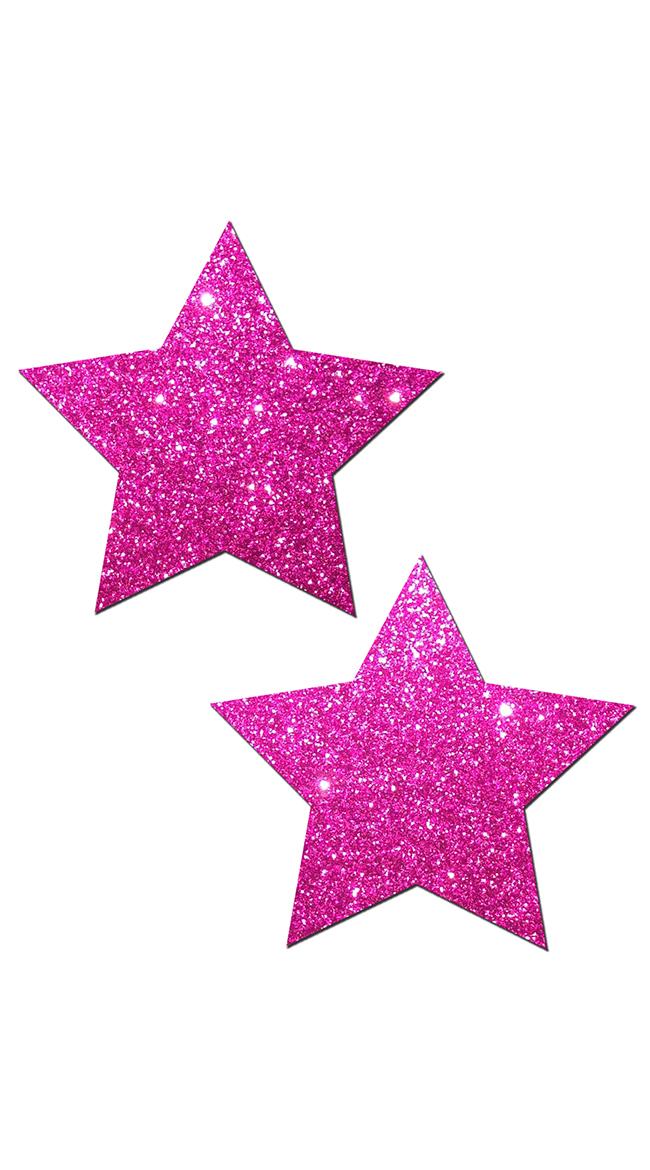 Star shaped pasties in hot pink glitter feature a latex-free, medical-grade, waterproof adhesive that leaves no residue when gently removed.