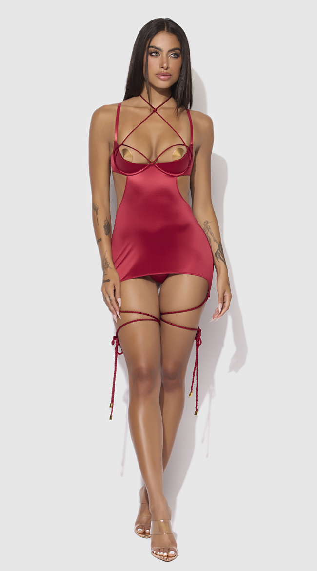 Rope-tied cups and an open back make this satin chemise a vision of soft surrender. Complete with a sheer G-string to match.
