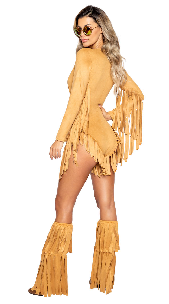 Make love not war, babe. Embrace your tree-hugging, free-spirited youth with psychedelic drugs in this Keep The Peace costume featuring a faux suede romper with long sleeves and fringed tassel accents, and a bronze studded peace sign accent. (Fringe boot covers and sunglasses not included.)