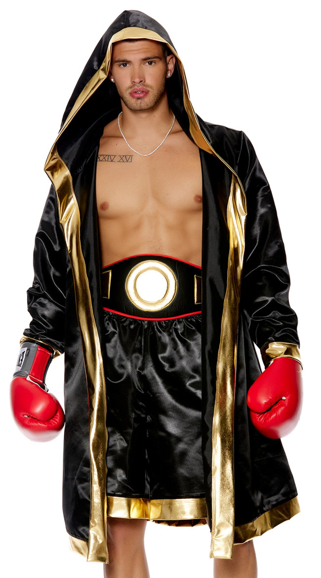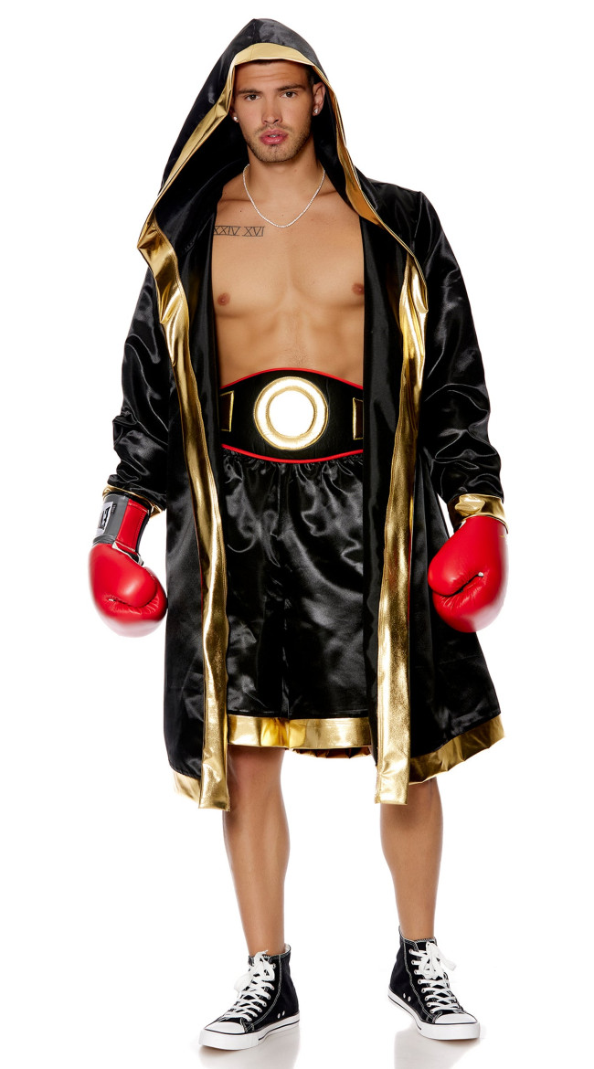 Step into the ring like a true champion with the Knockout Champ Men's Boxer Costume. This powerful look features a black and gold hooded robe, matching boxer shorts, and a championship-style belt that makes you the star of fight night. Pair it with your own gloves (sold separately) to complete the ultimate knockout look.