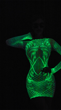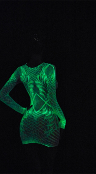 Glow sexy and unstoppable in this glow-in-the-dark mini dress, featuring sheer patterned mesh that highlights your curves, long sleeves for a sleek silhouette, and a body-hugging fit that stuns from every angle.