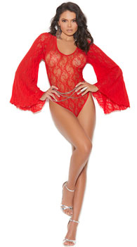 Give your lingerie eye-catching style in this stunning lace teddy featuring sheer lace cups, a scoop neckline, long bell sleeves, a low scoop back keyhole, a sheer lace crotch, and a cheeky cut back. (Jewelry not included.)