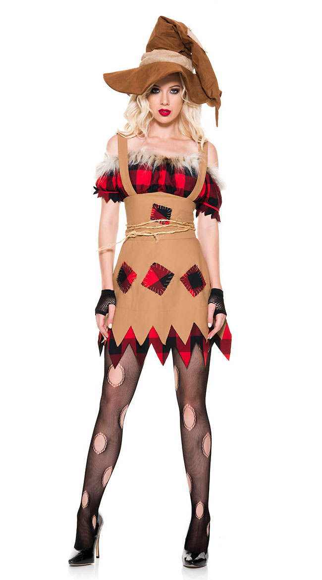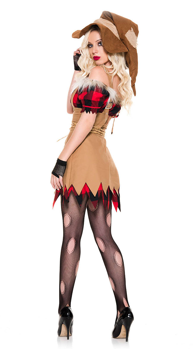 What a frightening sight! Terrify any birds coming to your field in this Living Scarecrow costume featuring an off-the-shoulder checker patch dress with faux fur trim, a patch apron overlay with adjustable straps and a sheared hemline, a rope belt, fingerless mesh gloves, a suede oversize hat, and mesh pantyhose with hole details.