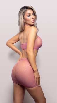 Say it without saying a word. The Love Poem set pairs a sleek halter top with a curve-hugging mini skirt in a mix of floral framing knit and fishnet that highlights every angle. Sheer, sculpting, and effortlessly flirty, this look brings soft romance with a bold edge. Wear it your way—this one speaks for itself.