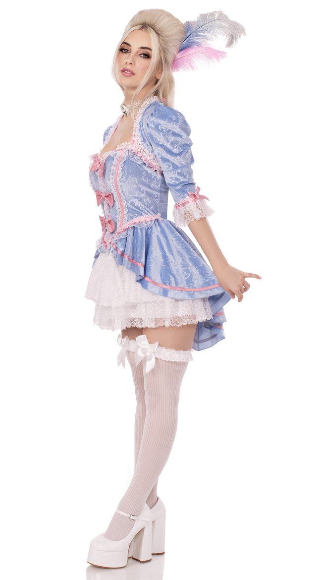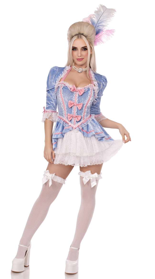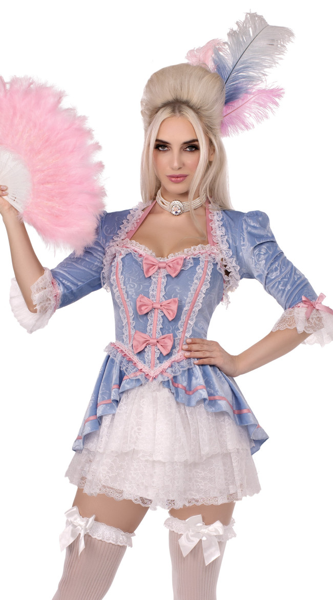 Embrace your inner aristocrat in this seductive, vintage-inspired costume! The stunning blue velvet corset with pink ribbon bows and lace accents hugs your curves, while the flouncy white skirt adds a flirtatious touch. A delicate choker and puffed sleeves complete the look, giving you a timeless and elegant vibe. Pair with your own fan and headpiece (not included) for an unforgettable look, and don’t forget the thigh highs (sold separately)!