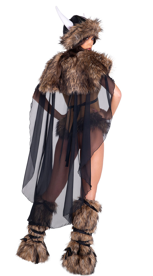 Declare war, darling. Fight fur-ever in this Medieval Viking costume featuring a suede romper with faux fur trim, a mesh fur trim cape with an attached studded harness, and a horned Viking helmet. (Axe and boot covers not included.)