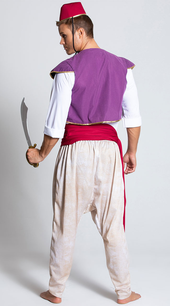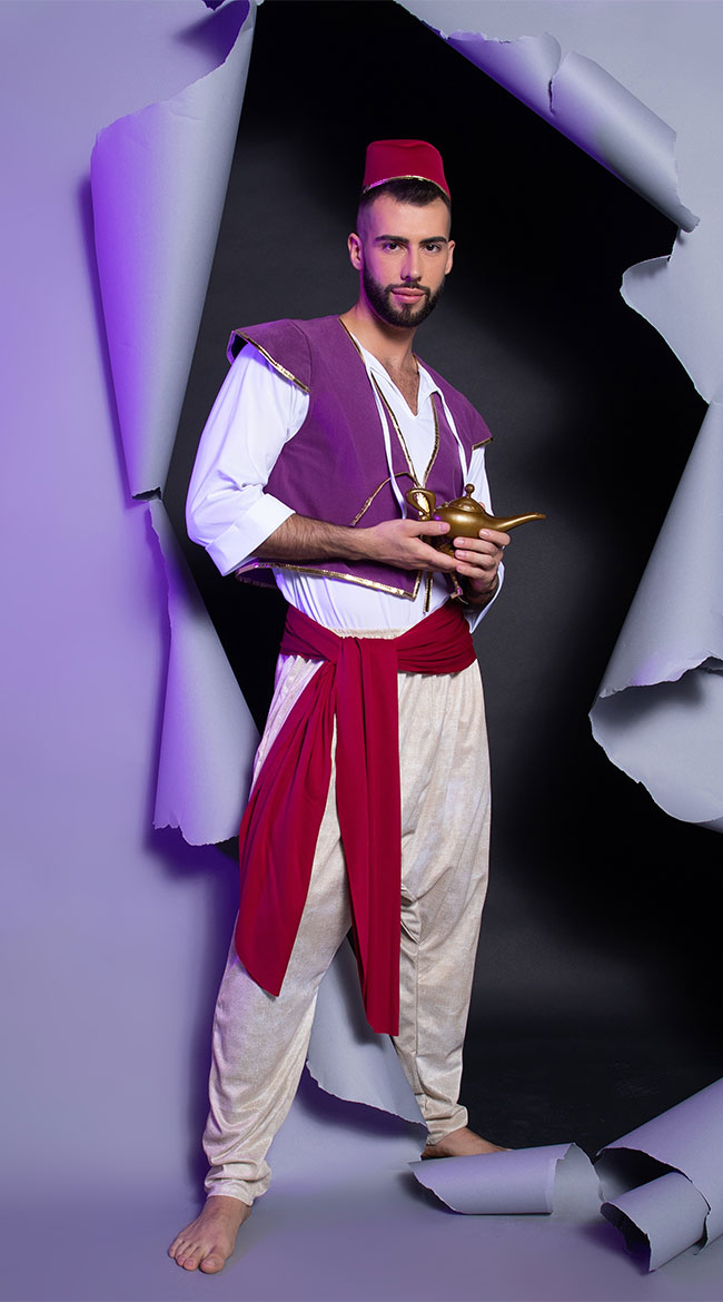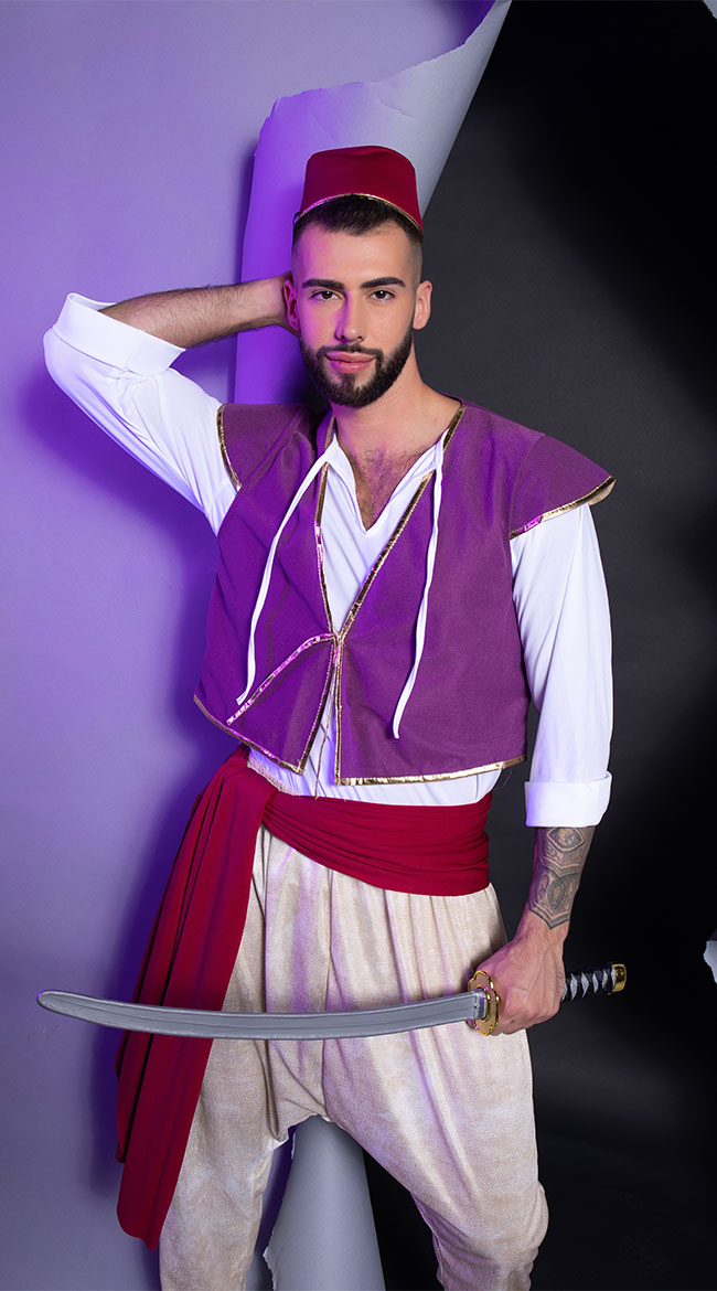 The world is yours to explore! Take a seat on a magic carpet and soar through the sky in this men's Arabian Folk Hero costume featuring a white tunic shirt, a cropped purple vest with gold trim, a red waist sash, harem pants, and a hat. (Sword, lamp, and sandals not included.)