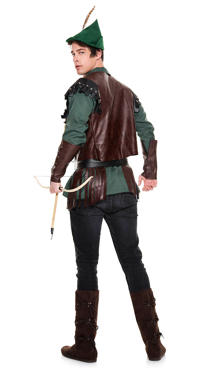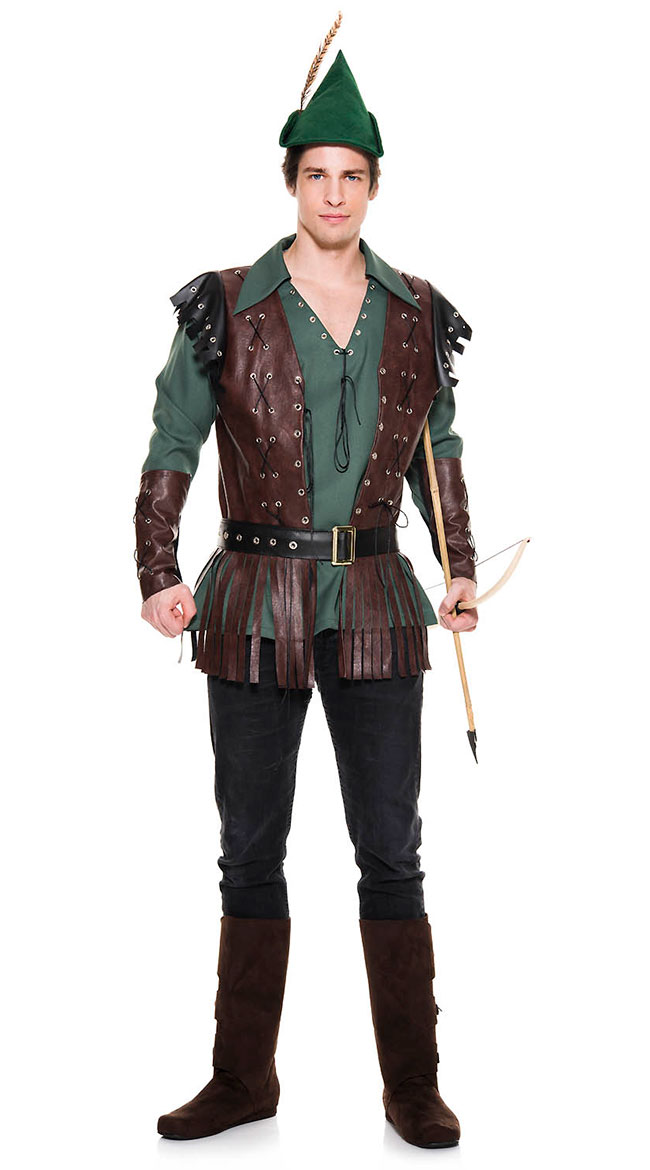 Defend the forest with your merry gang! Fight against greed for the good of your people in this men's Charitable Robin costume featuring a long sleeve V-neck shirt with grommet accents, an oversized collar, and a string tie, a wet look vest with metal ring details and fringe accents, matching arm gauntlets, an adjustable belt, and a hat with a feather. (Bow and arrow, pants, and boots not included.)