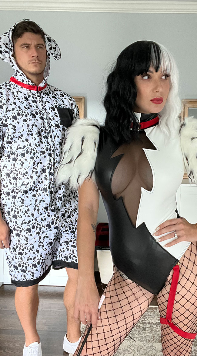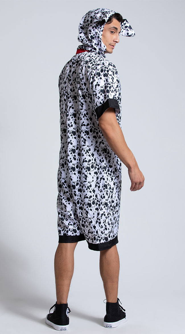 Lounge on the couch in this men's Dalmatian Dog costume featuring a spotted jumpsuit with short sleeves, black cuffs, a front zipper closure, a black pocket accent, and an attached hood with ears.