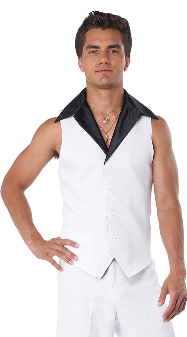 Get down and boogie! Show off your moves in this men's Disco Dream costume featuring a white vest with an attached black collar, front button closures, a white jacket with an open front, faux pocket details, add matching bellbottom pants. (Shoes and jewelry not included.)