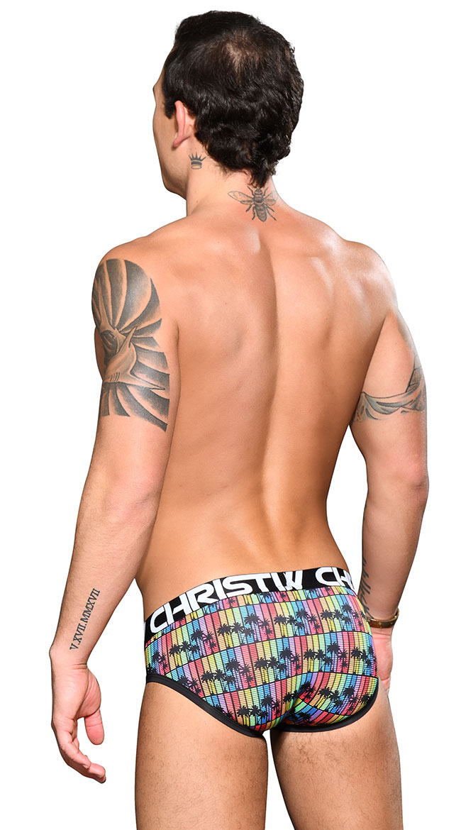 You'll be California Dreamin' in this sexy men's brief featuring a low elastic waistband with Andrew Christian logo, an all over colorful palm tree print with contrast trim, and a full cut back.