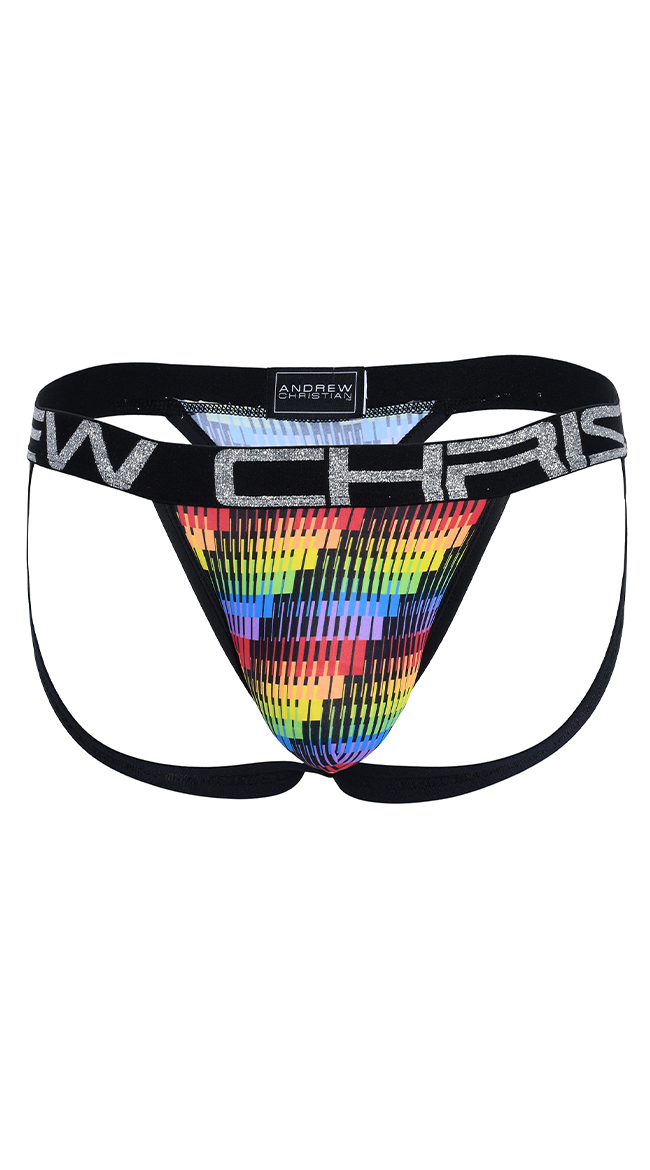 Show off your best assets in this men's jock featuring a black elastic waistband with "ANDREW CHRISTIAN" printed in silver, a disco rainbow design, and a thong cut back with booty framing straps.