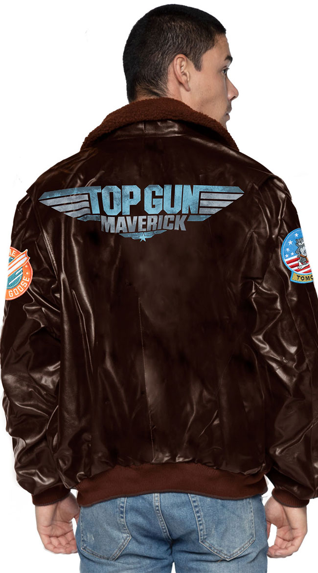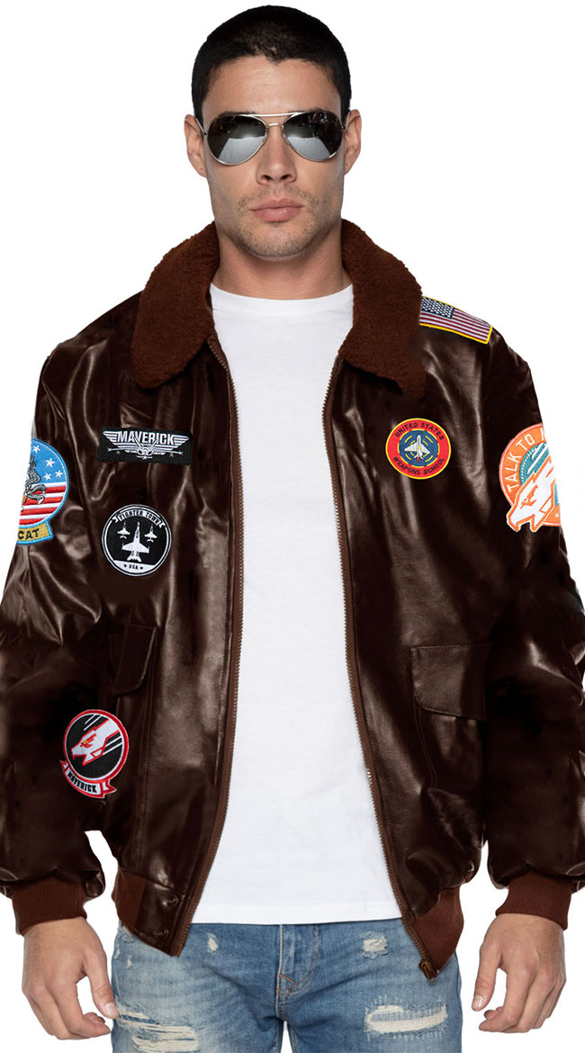 Up, up and away! Soar head first into the clouds in this men's Flying High Maverick costume featuring a brown bomber jacket with aviator patches, a Top Gun Maverick back patch, a fuzzy collar, and a full zip-up front. (Glasses, white shirt, and jeans not included.)