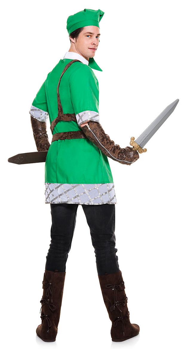 Be a hero throughout the ages! Save the day and your lady in this men's Legendary Elf costume featuring a green tunic with a white high collar and shiny silver accents, a weathered look body belt, fingerless arm gauntlets, and a green elf hat. (Sword, pants, and boots not included.)