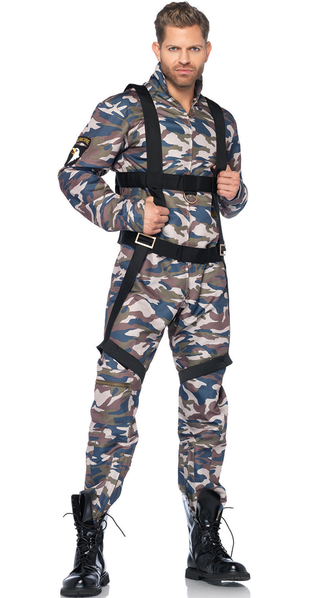 Be an army rockstar in this men's Military Combat Stud costume, featuring a full body camouflage jumpsuit with military patches on the arm, and a body harness to strap over the suit.