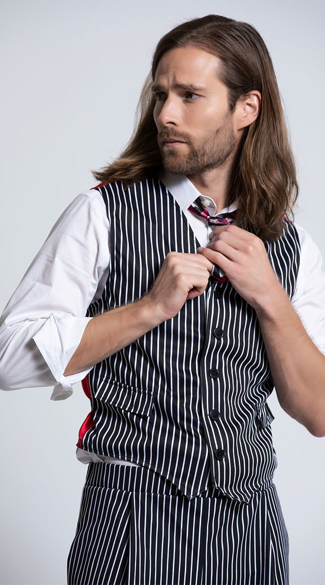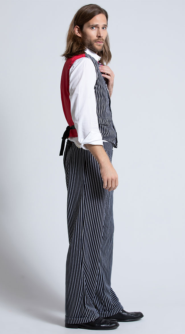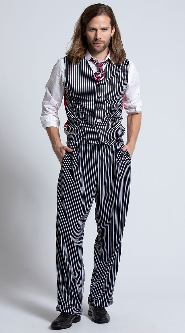 You'll run this town in this Men's Mobster costume featuring a pinstripe vest with red back, matching pants with pockets, and red and black art deco tie. (Fedora, shirt, cigar, and gun not included.)