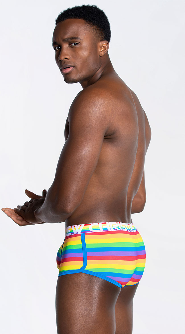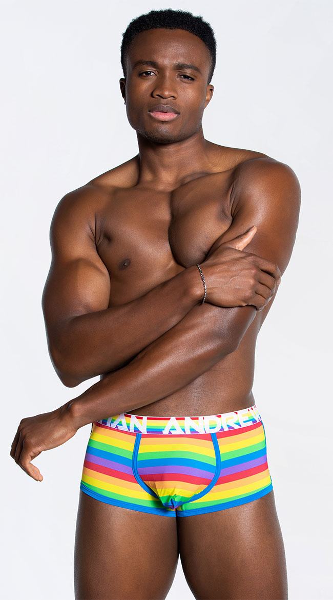 Catch your lover's eye in this stunning men's boxer featuring a low elastic waistband with Andrew Christian logo, a horizontal striped rainbow print with contrast trim, and a full cut back.