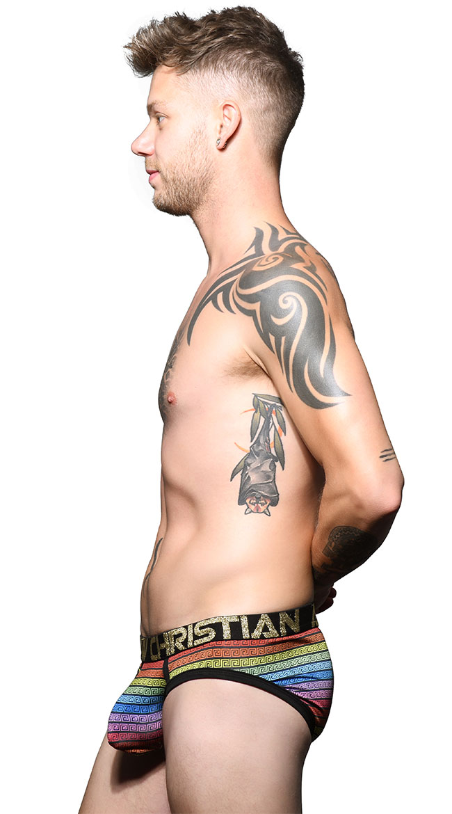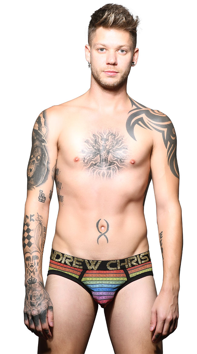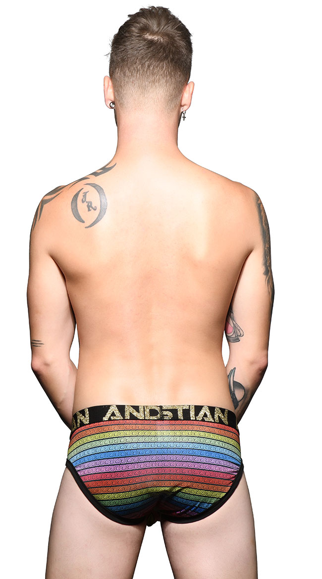 Bring color to your sexy night in this vibrant men's brief featuring a low elastic waistband with Andrew Christian embroidered in gold glitter, a striped rainbow print with contrast piping, and a full cut back.