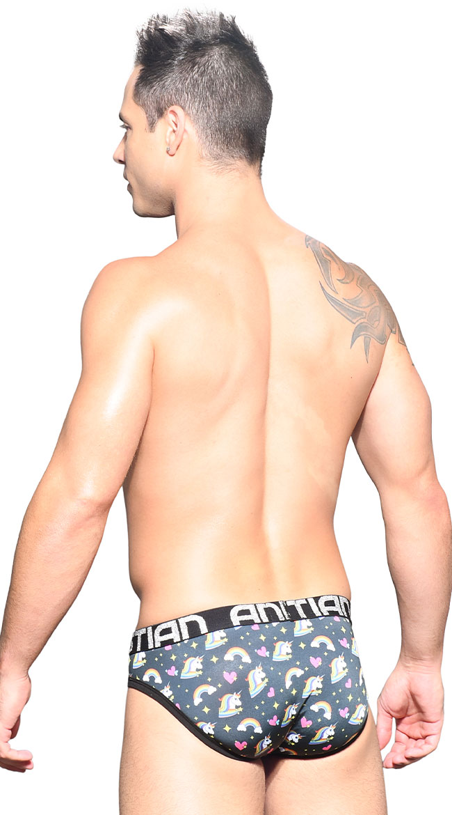 You'll be over the moon with excitement in this sexy men's brief featuring a low elastic waistband with Andrew Christian embroidery, a rainbows and unicorns outer space print with contrast trim, and a full cut back.