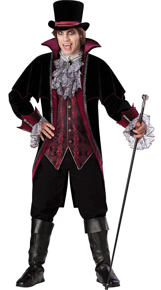 Elegantly prowl the night in this men's Vampire of Versailles costume featuring a long black velvet coat with attached capelet, long sleeves with red cuffs, sheer white lace trim, a high collar, a red brocade vest with front button closure, a matching lace dickie with jewel embellishment, a black top hat with a burgundy ribbon, and black boot covers. (Cane and pants not included.)
