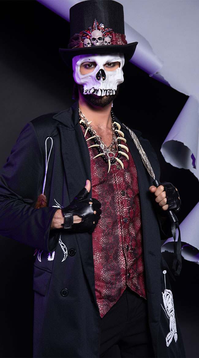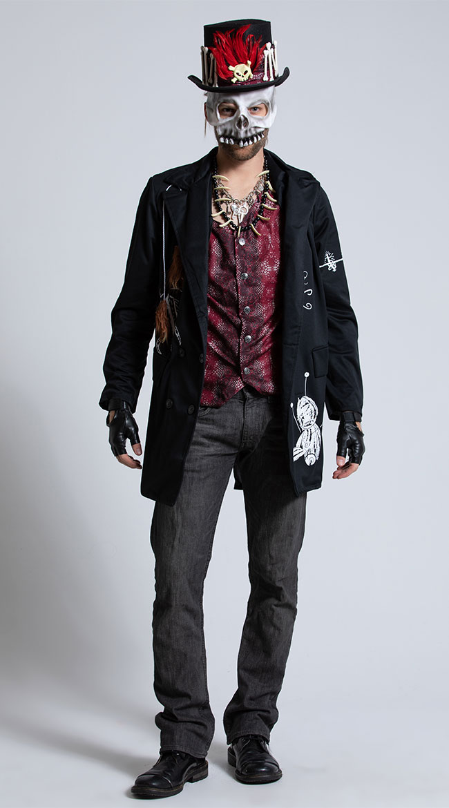 Cast some dark magic in this men's Voodoo Dude costume featuring a black jacket with long sleeves, button accents, allover white sketched decals, monkey hands attachment, an attached red vest, a black top hat with a dark red ribbon, and a white skeleton mask. (Necklace, snake, and pants not included.)