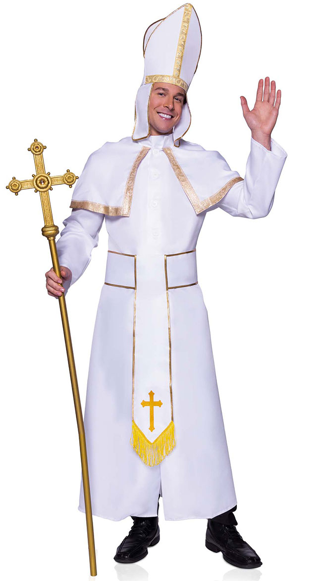 Bring the congregation to their knees in this men's White and Gold Pope costume featuring a long white robe with long sleeves, an attached cape with a gold trim, front button closures, a gold trimmed belt with a gold cross decal and fringe trim, and a matching hat with draping pieces. (Staff and pants not included.)