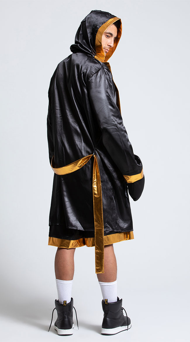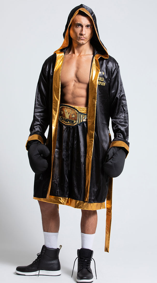 Exude the attitude of a champion in this Men's World Champion Boxer costume featuring a black hooded satin robe with gold hems, "World Champion" emblem, matching black and gold shorts, a gold "World Champion" belt, and black boxing gloves. (Shoes and socks not included.)