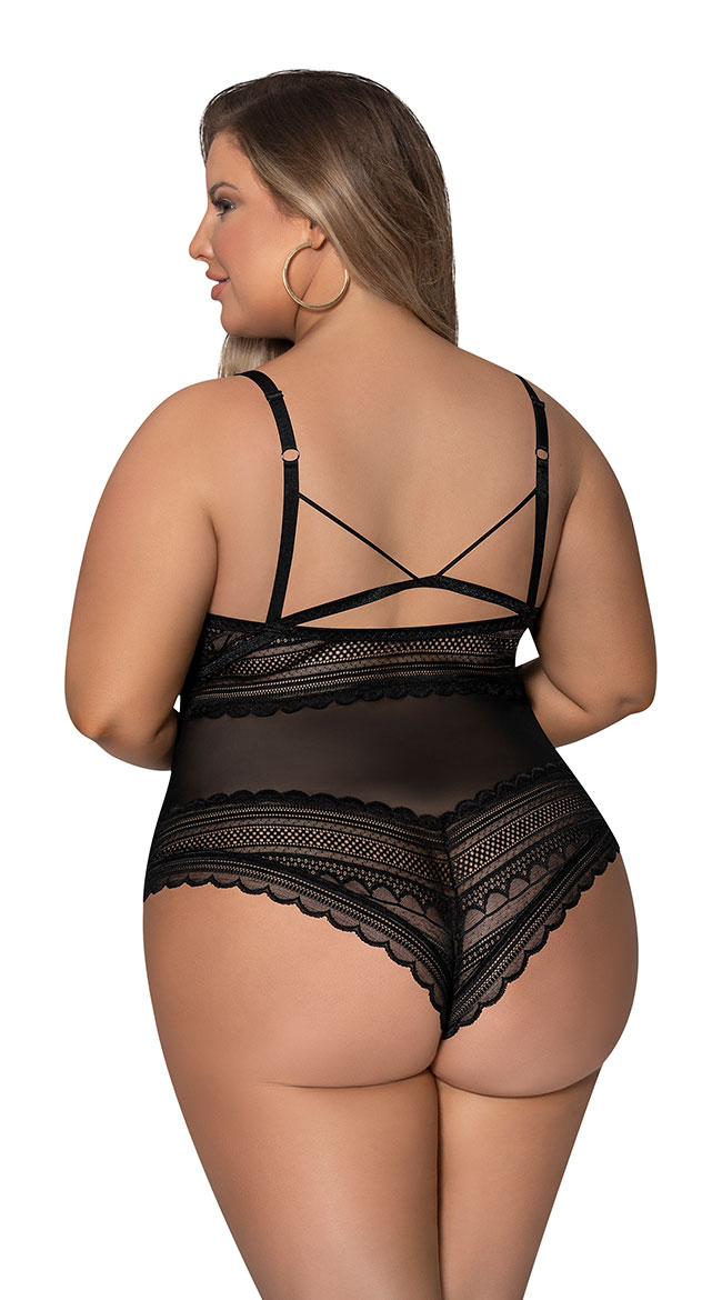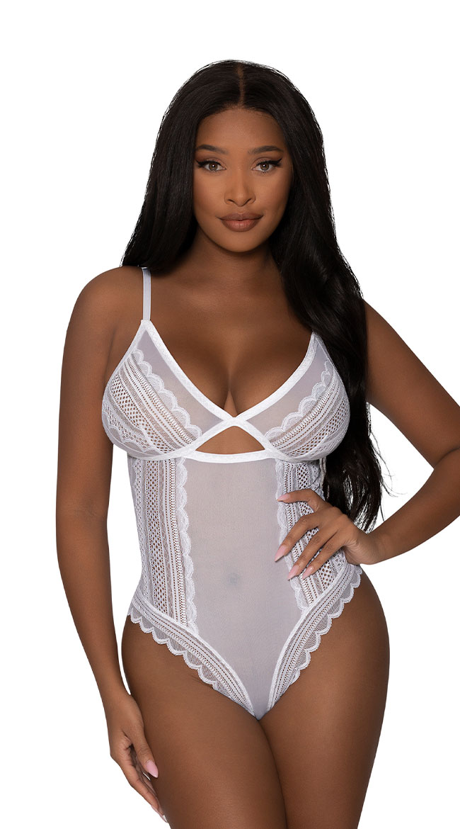 Tempt and tease in this sexy teddy featuring sheer multi-net cups, adjustable spaghetti straps, a strappy back band, a front keyhole opening, a sheer mesh bodice with multi-net paneling, a scalloped trim, and a high cheeky cut back.