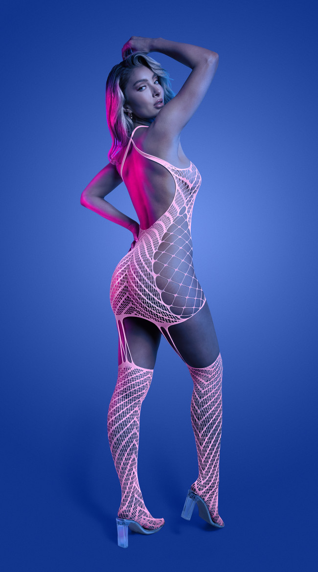 Feel confident, radiant, and powerful in every curve with the inclusive Metamorphic Bodystocking Dress. Made with soft, flexible materials and flattering lines, this piece encourages self-love and pride in your own skin. It’s a confident step in your personal expression and sensual identity. From bold silhouettes to gentle textures, Metamorphic Bodystocking Dress is more than lingerie—it's a form of empowerment. Metamorphic Bodystocking DressGlow-in-the-dark bodystocking dress; glows pink