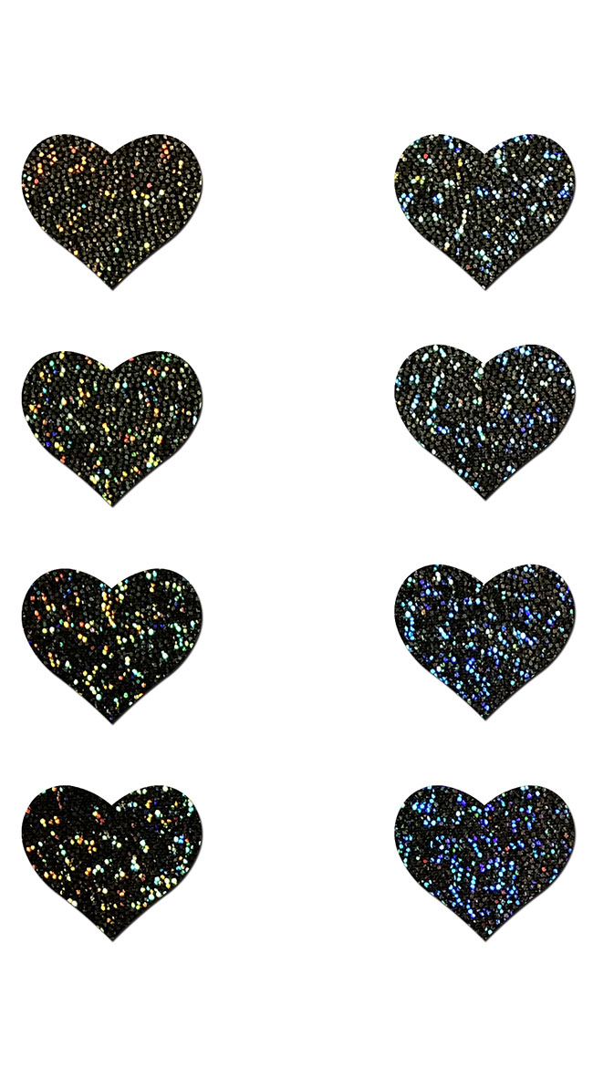 This cute eight pack of pasties features a black glittery heart design and a latex-free, medical-grade, waterproof adhesive that will stay securely in place until gently removed.