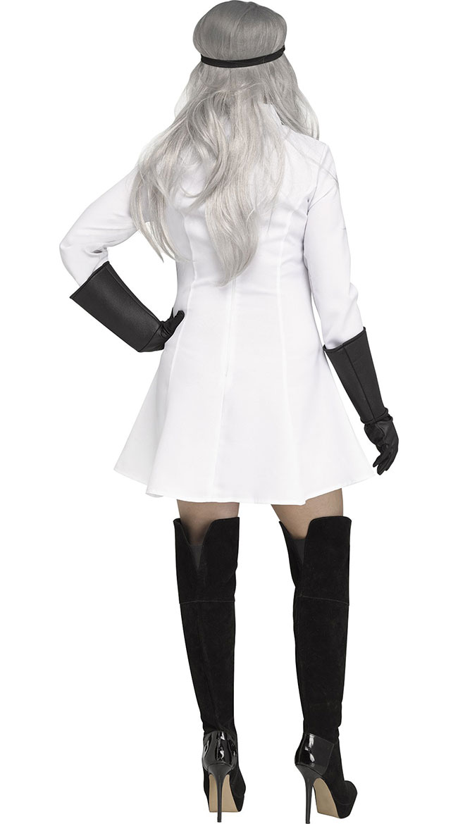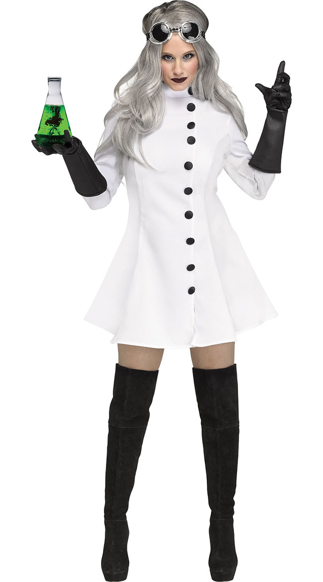 With your crazy evil experiments, you'll be ready to take over the world! This Must Be Mad Scientist costume features a lab coat dress with front buttons, a high collar, a back zip closure, black gloves, and a pair of goggles. (Wig, beaker, and boots not included.)