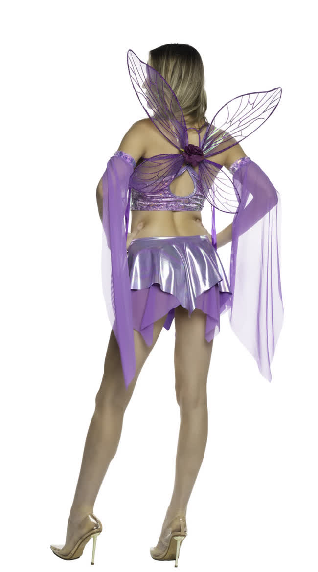 Transform into a mystical enchantress in this sexy purple fairy costume! The sparkly, sheer top and metallic skirt shimmer with every movement, while the flowing, translucent wings add a touch of whimsy and magic. With the flattering fitted bodice and playful skirt, this look will have you floating into the spotlight at any costume event. Get ready to sprinkle some fairy dust and enchant everyone around you!